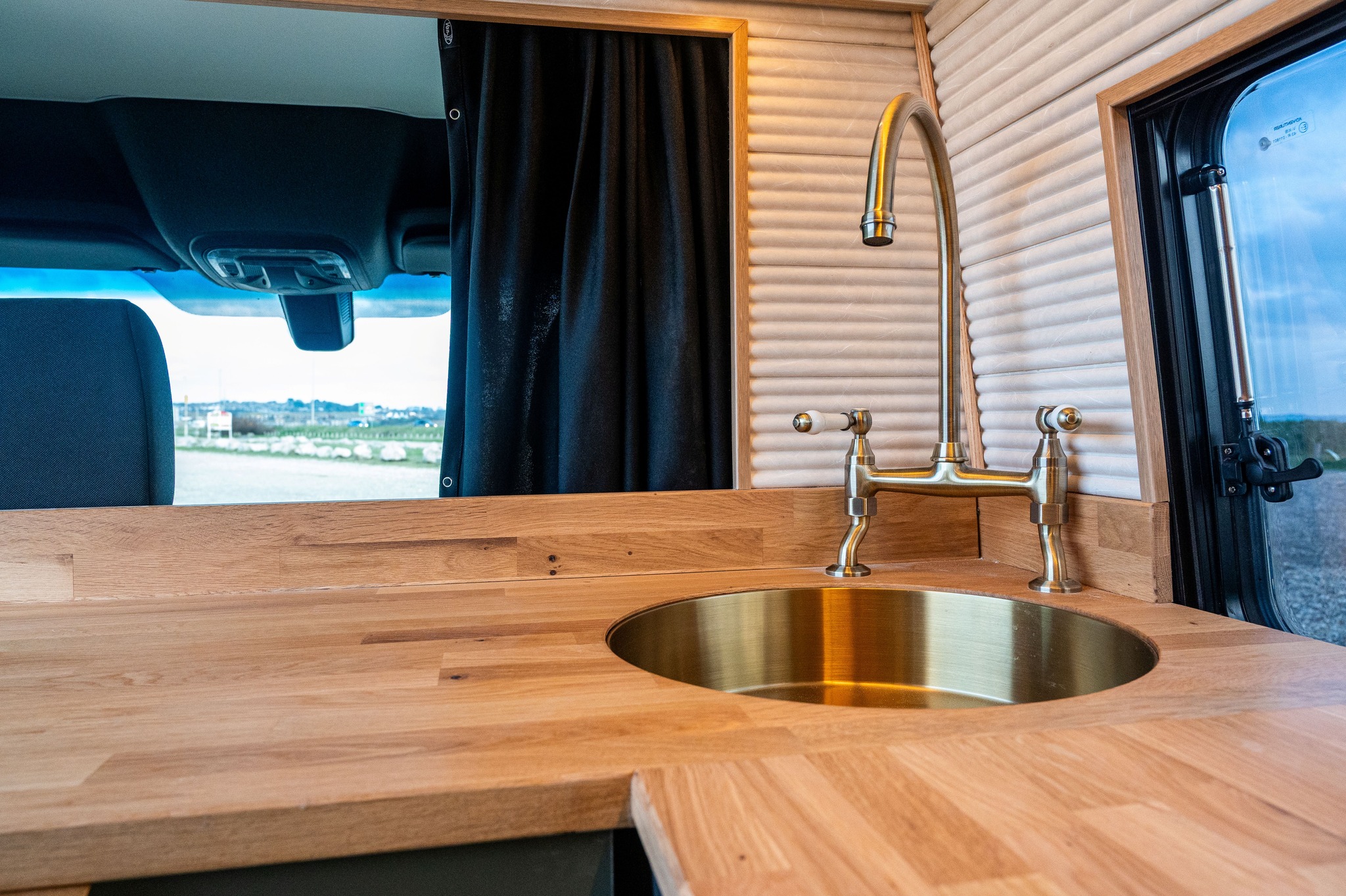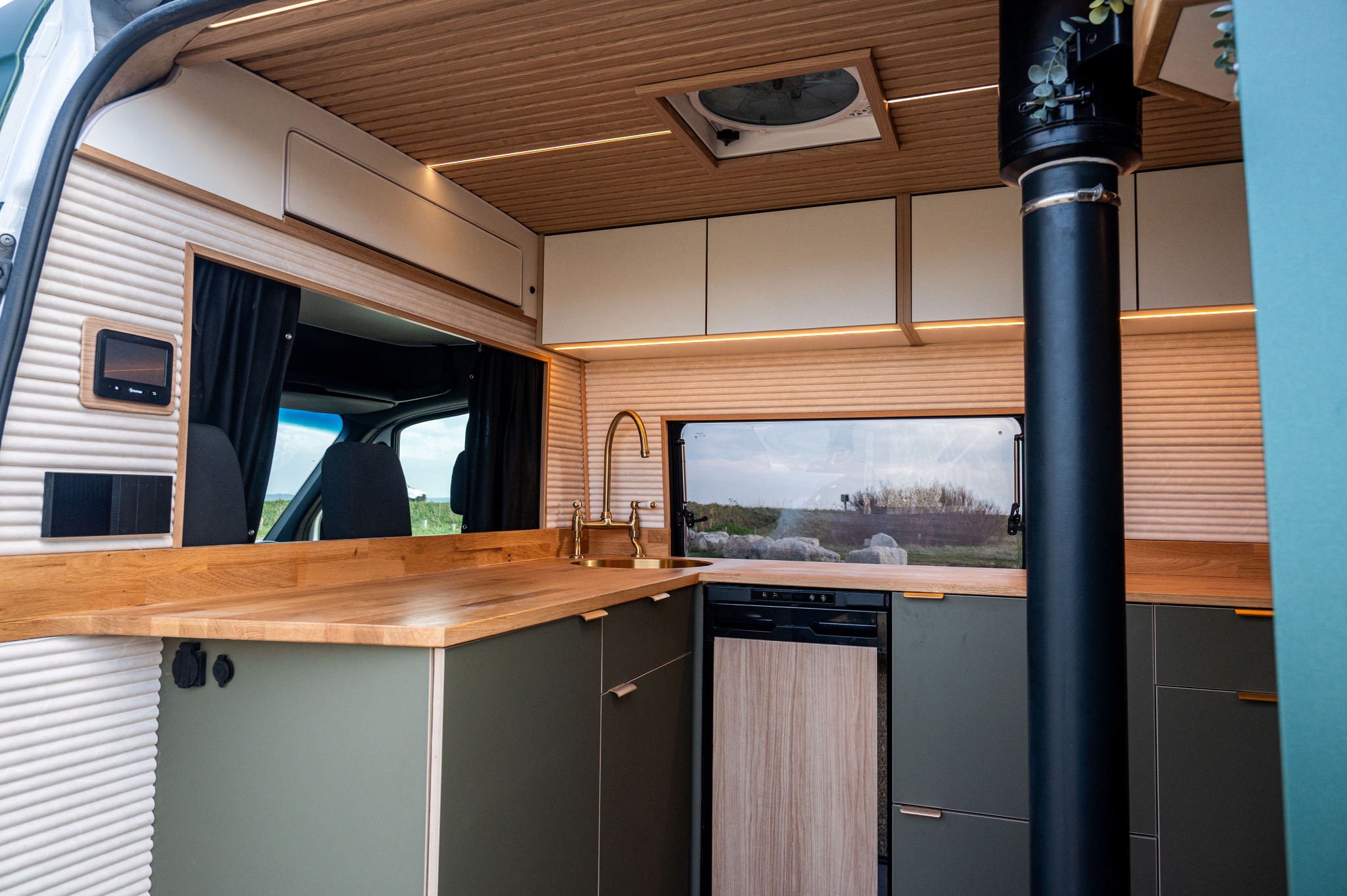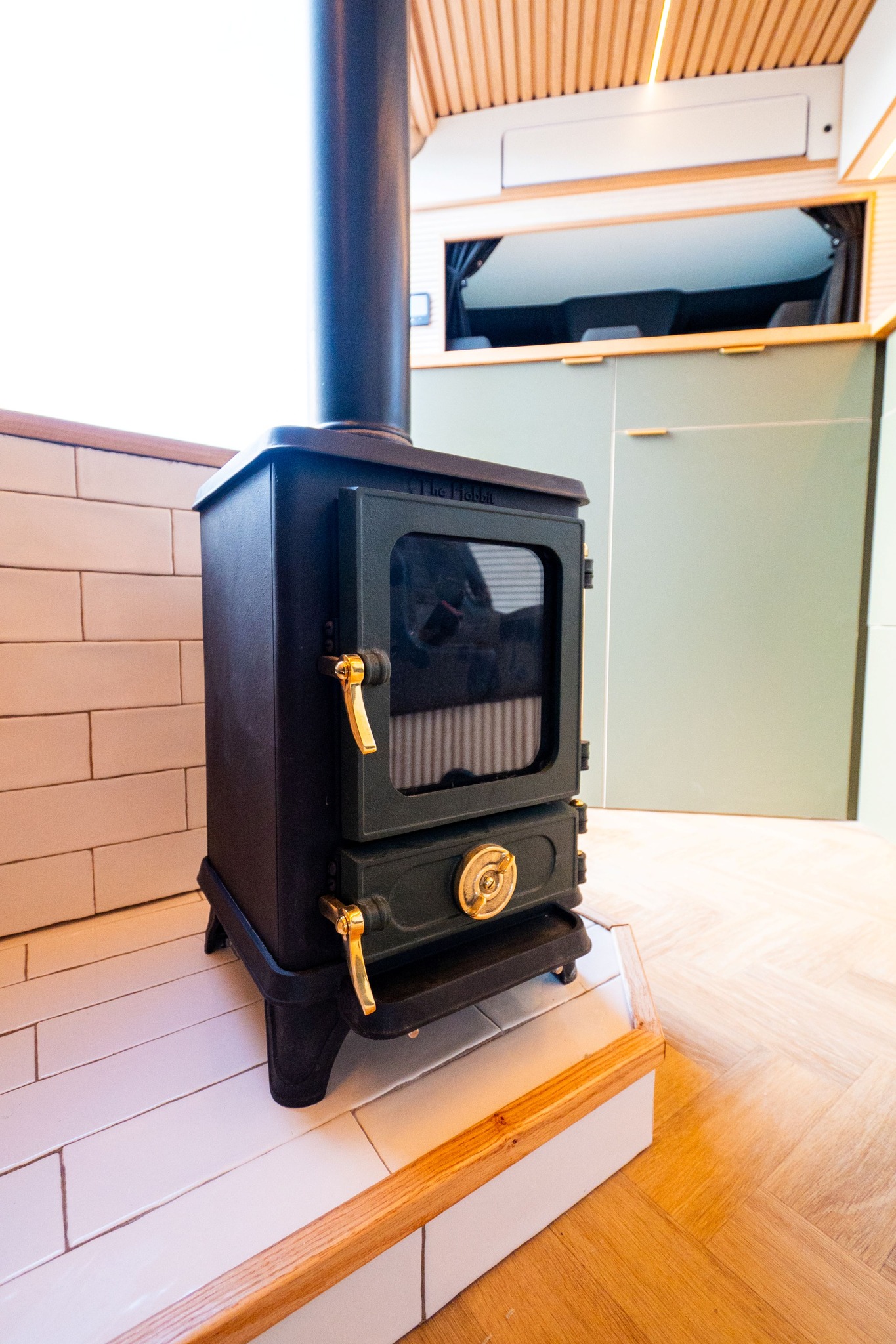 M2M Conversions chose to have our camper wood stove, The Hobbit Stove, for this campervan conversion. Our mini log burner for a van is the perfect size to not feel overwhelming in your small space and with its 4.1kW output and cooking capabilities, it is the perfect off-grid companion. Our small camper wood stove is made from high-quality cast iron, making it extremely durable and hard-wearing, and it retains heat for a very long time, even after the fire has gone out. Most campervan log burners are made of steel, a material that cannot match the heat retention when compared to cast iron – and when you are travelling in freezing temperatures, you need a heating source you know you can rely on!