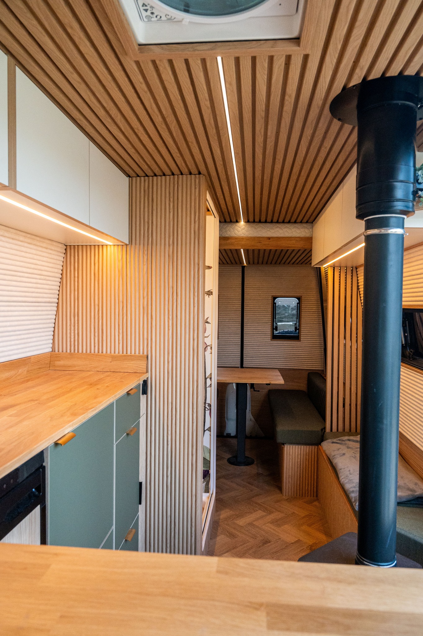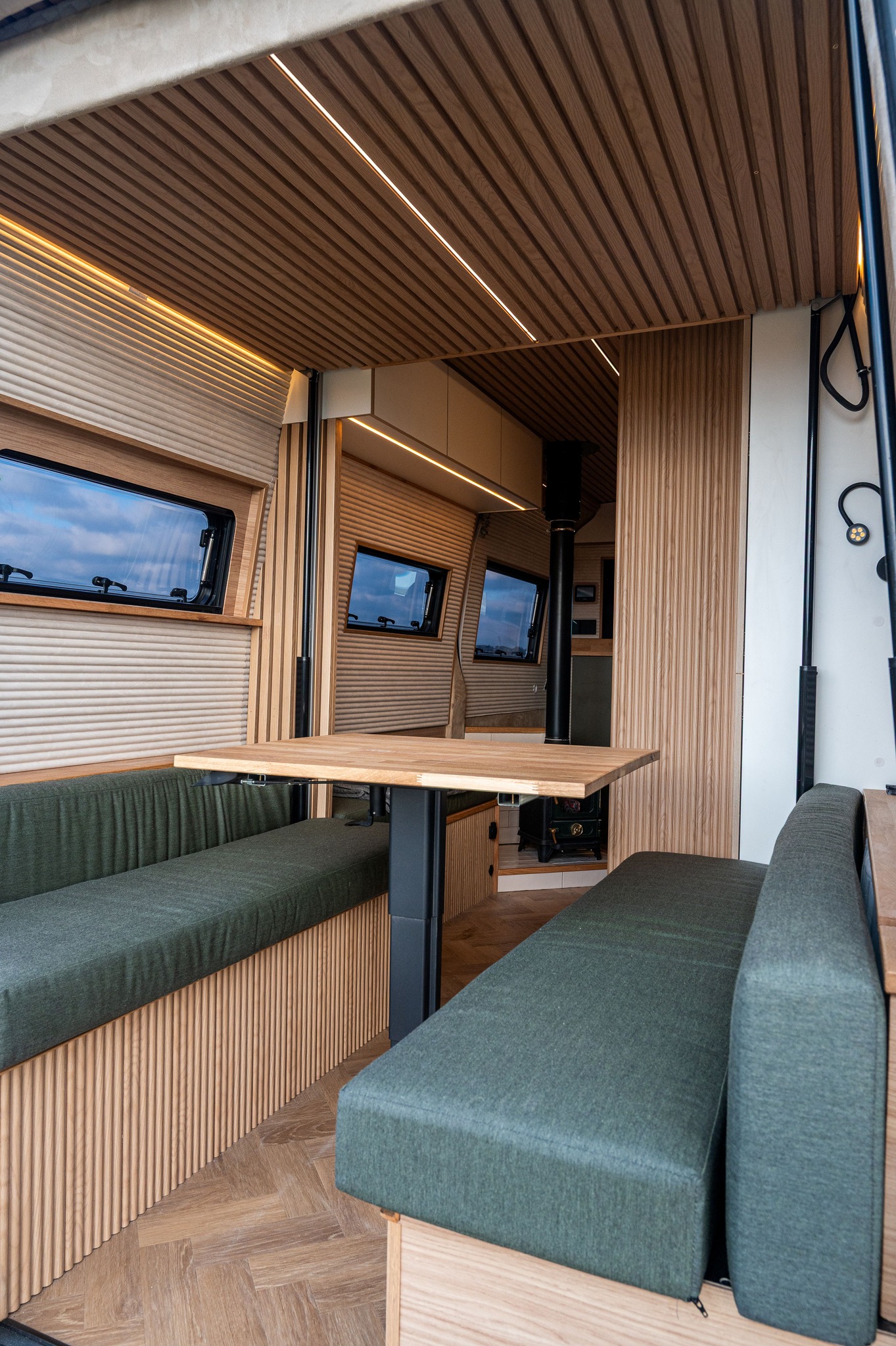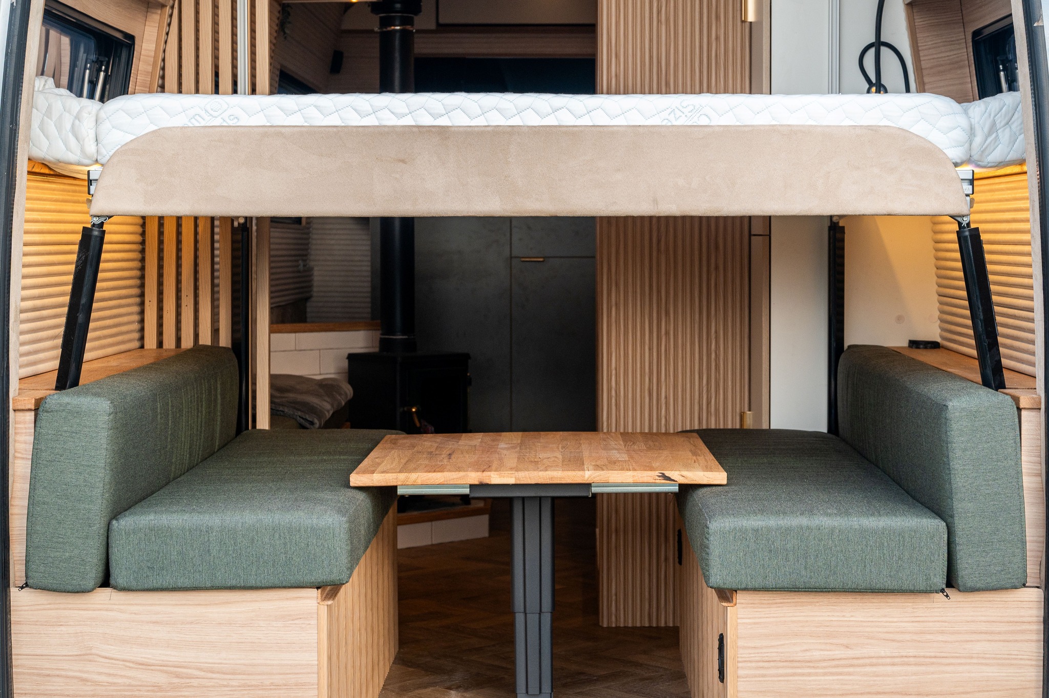 Sprinter conversion with a small wood stove for a camper