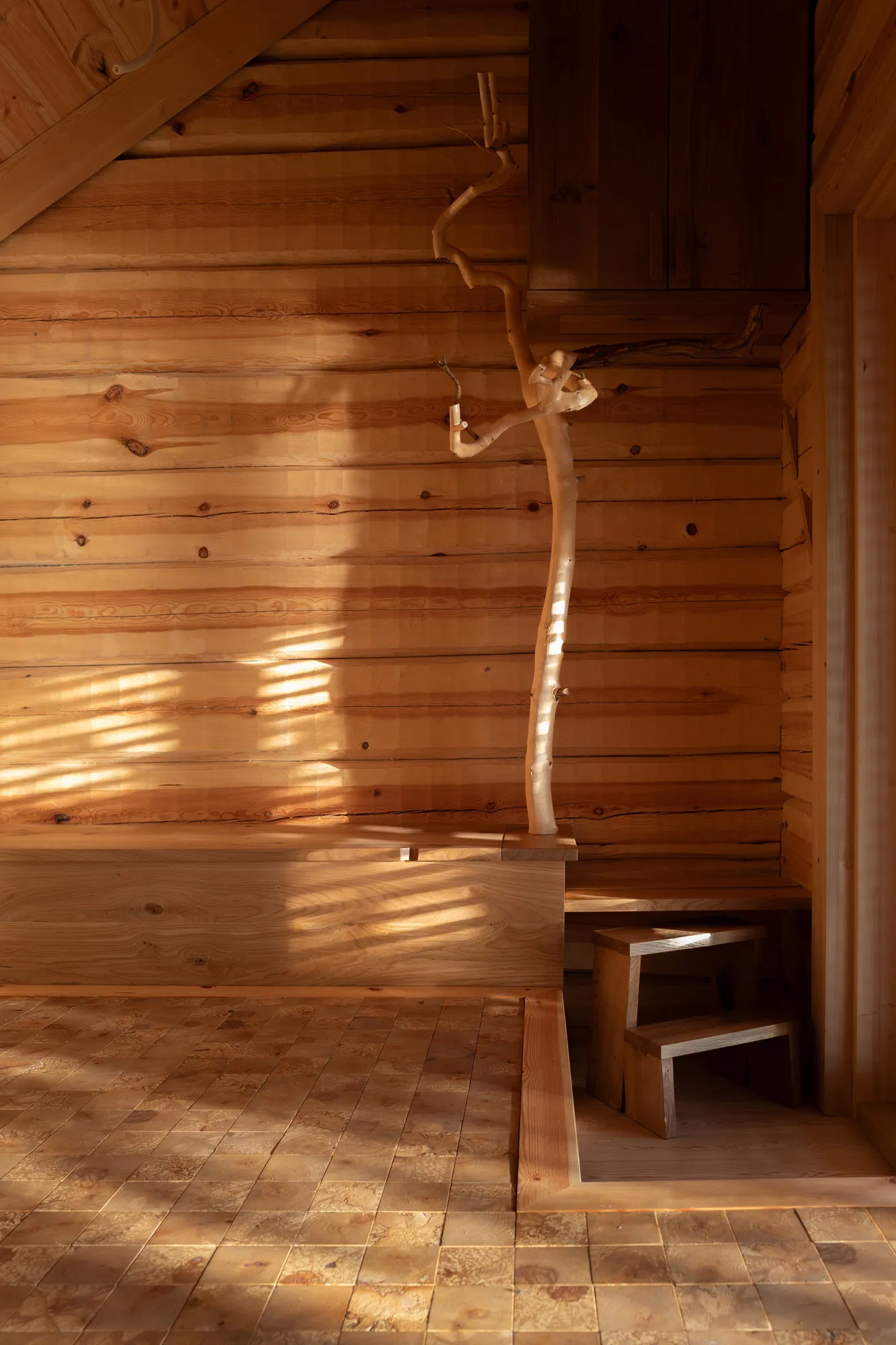 Nestled on Kaunissaari, an island in Finland’s archipelago, Puusauna reimagines the traditional sauna by fusing age-old log cabin building methods with contemporary architecture, all while harnessing the essence of wood. Rather than concealing natural material, Torvinen left whole tree trunks intact as structural columns and visual features, giving the building a strikingly organic presence.