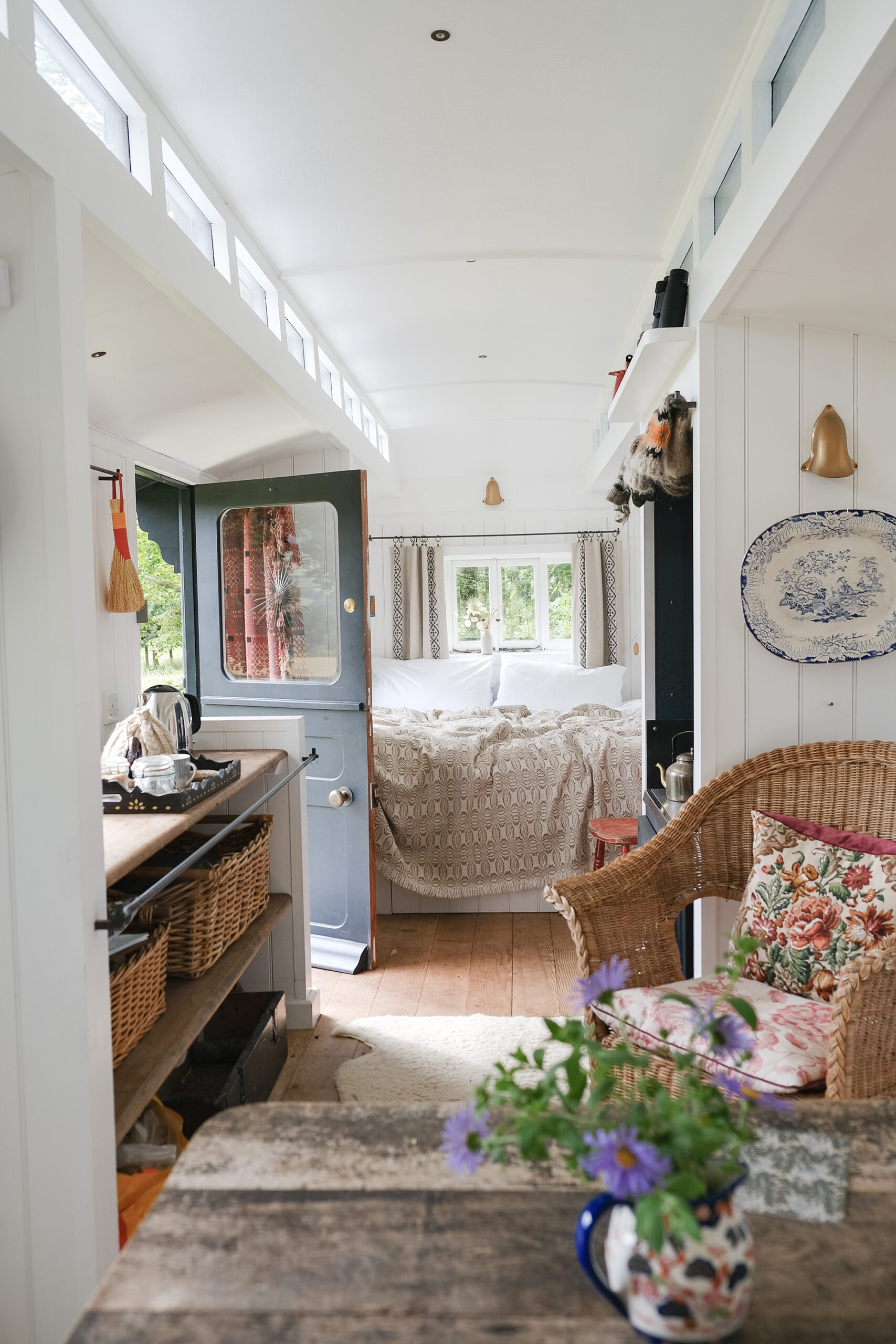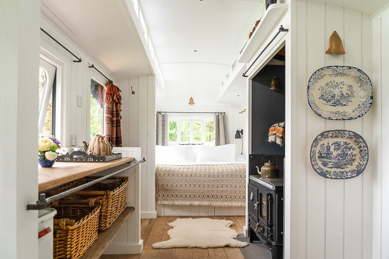 Stepping inside, you will be met with our Little Range Cookstove, the sweetest cast iron cookstove you will ever see! This little stove will keep the wagon warm and inviting all year round, and with its charming aesthetic, it fits so effortlessly with this converted wagon’s interior style.