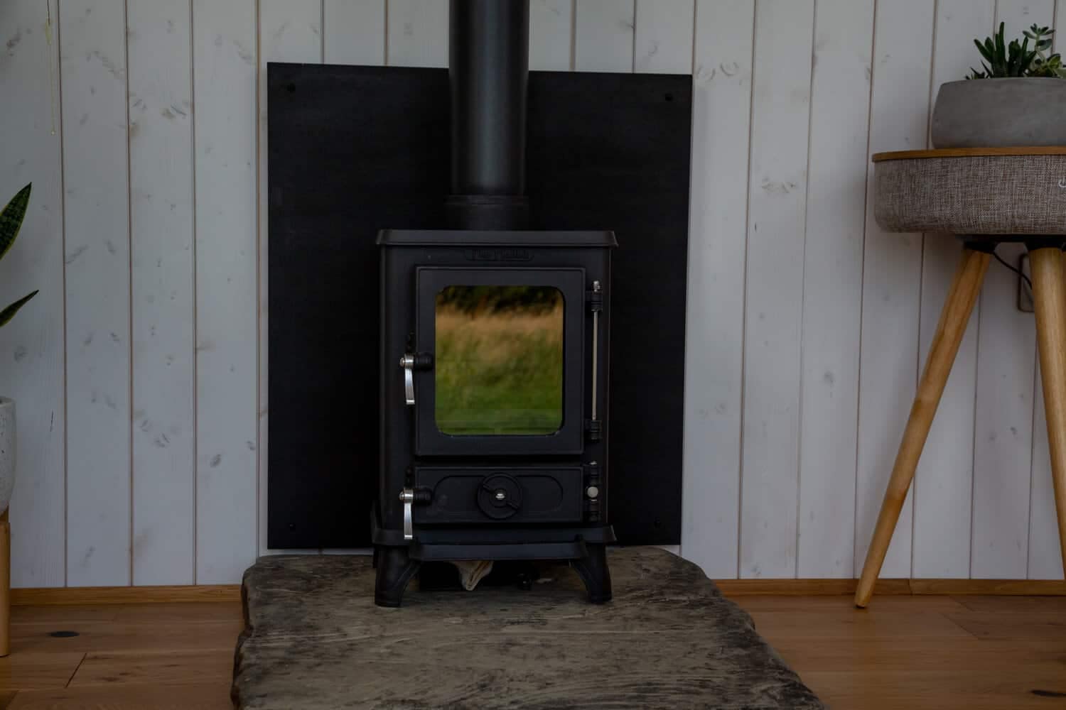 The stove will also need to sit on a hearth. This needs to be a non-combustible material that’s at least 12mm thick, and you will need to have at least 225mm of space from the front of the stove to the front of the hearth, in order to comply with regulations.