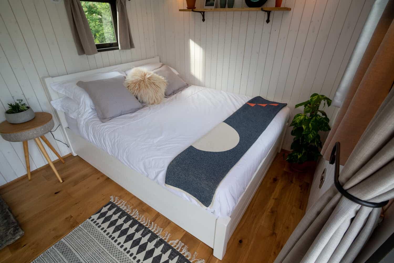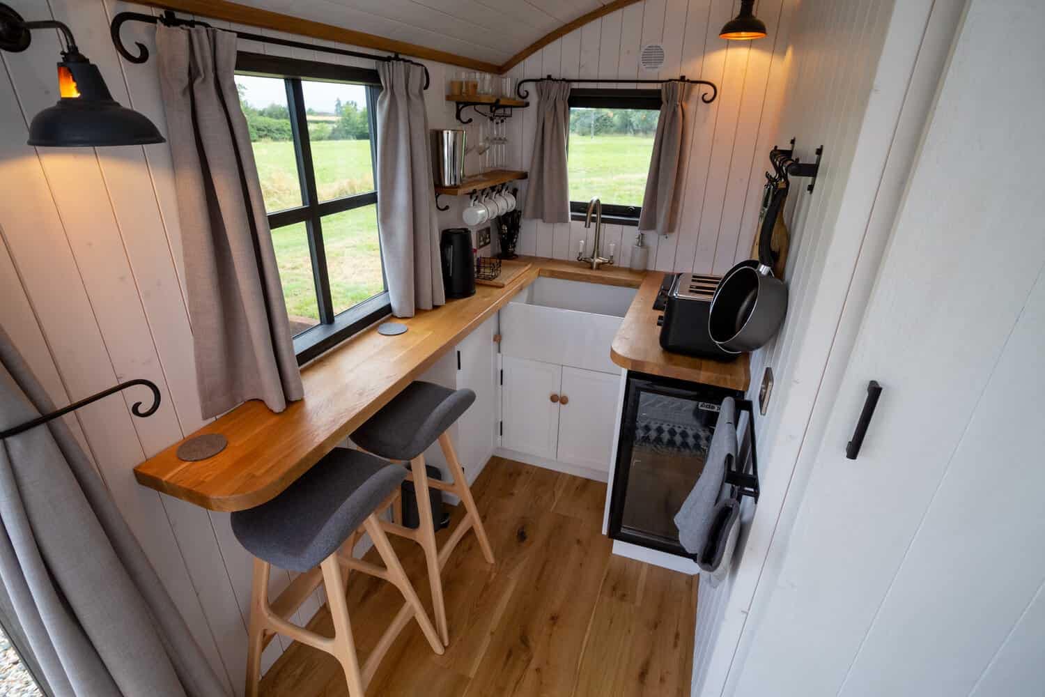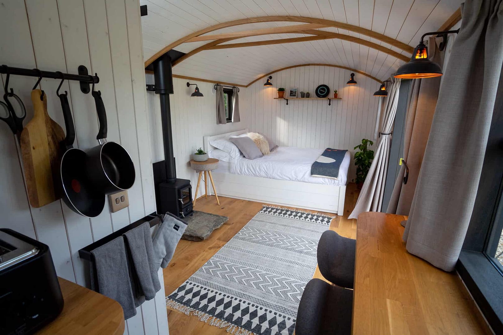 The hut has been hand crafted from oak, and the marbled effect on the slate hearth is equally eye-catching and special. Every element of the hut has been well-considered, and they really come together to create a truly magical place to stay! If you’re wondering how you might be able to incorporate our Hobbit stove into the design of your shepherd’s hut, then we’ve designed two different flue kits for shepherds’ huts, which makes it even easier to install your small wood burner into this type of structure.