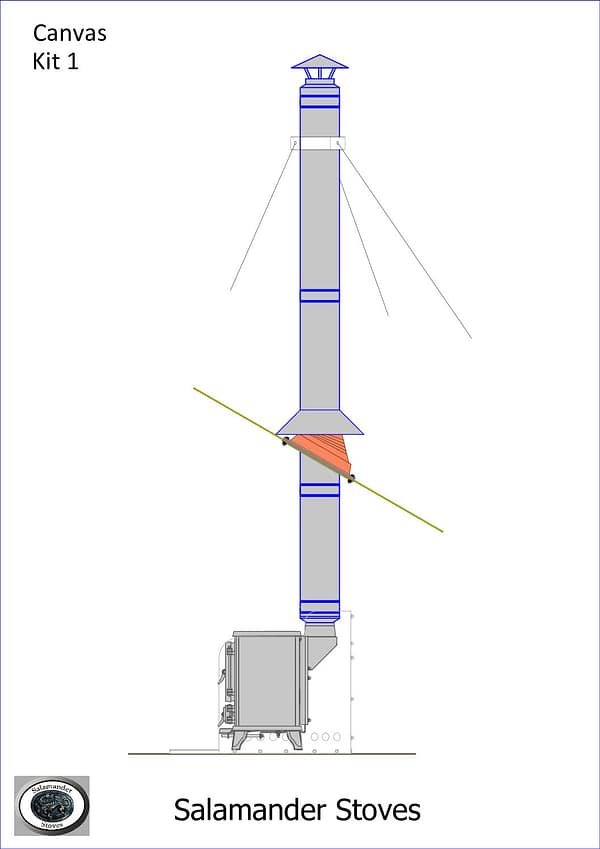 Over the past 15 years our Hobbit Stove and Little Range Cook Stove has been installed into various canvas glamping structures, such as bell tents, yurts and safari tents. We have designed a Canvas Flue Kit to suit any type of canvas structure! This kit consists of a 100mm/4″ appliance connector, please note that this will always be in stainless steel even in you choose black powder coating due to the proximity to the stove. It then goes into a 100mm/4″ twin wall 500mm length, our canvas flashing kit, 2 x 100mm/4″ twin wall 800mm lengths, 100mm/4″ twin wall standard cowl/rain cap then a storm collar. As an addition you can also add on a guy wire kit if you are in a high wind spot to add extra external support to the flue system. Our rear flue wedge and enclosure are two great options to have with this kit also!